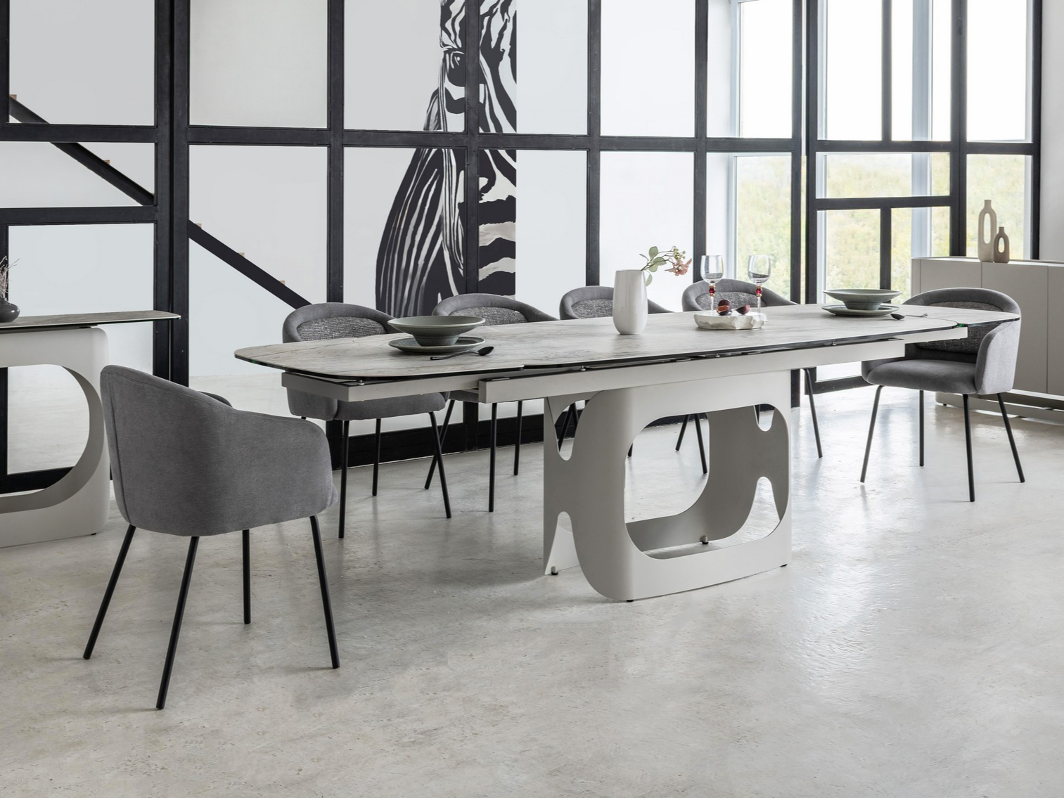 Прямокутна стільниця виготовлена з матової кераміки, посиленої гартованим склом, що забезпечує високу стійкість до подряпин, температурних перепадів і механічних пошкоджень. Завдяки боковому механізму розкладки, довжина столу може збільшуватися з 200 до вражаючих 280 см — ідеальне рішення для великих компаній або сімейних свят.