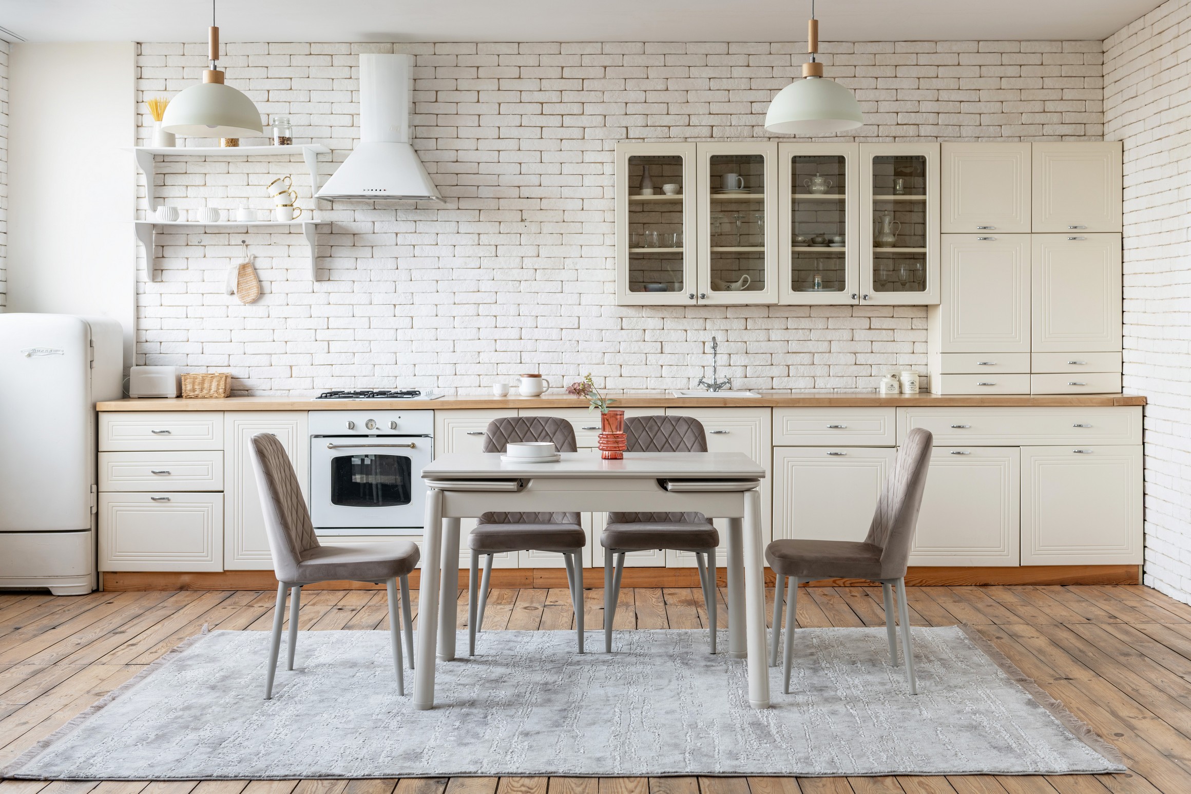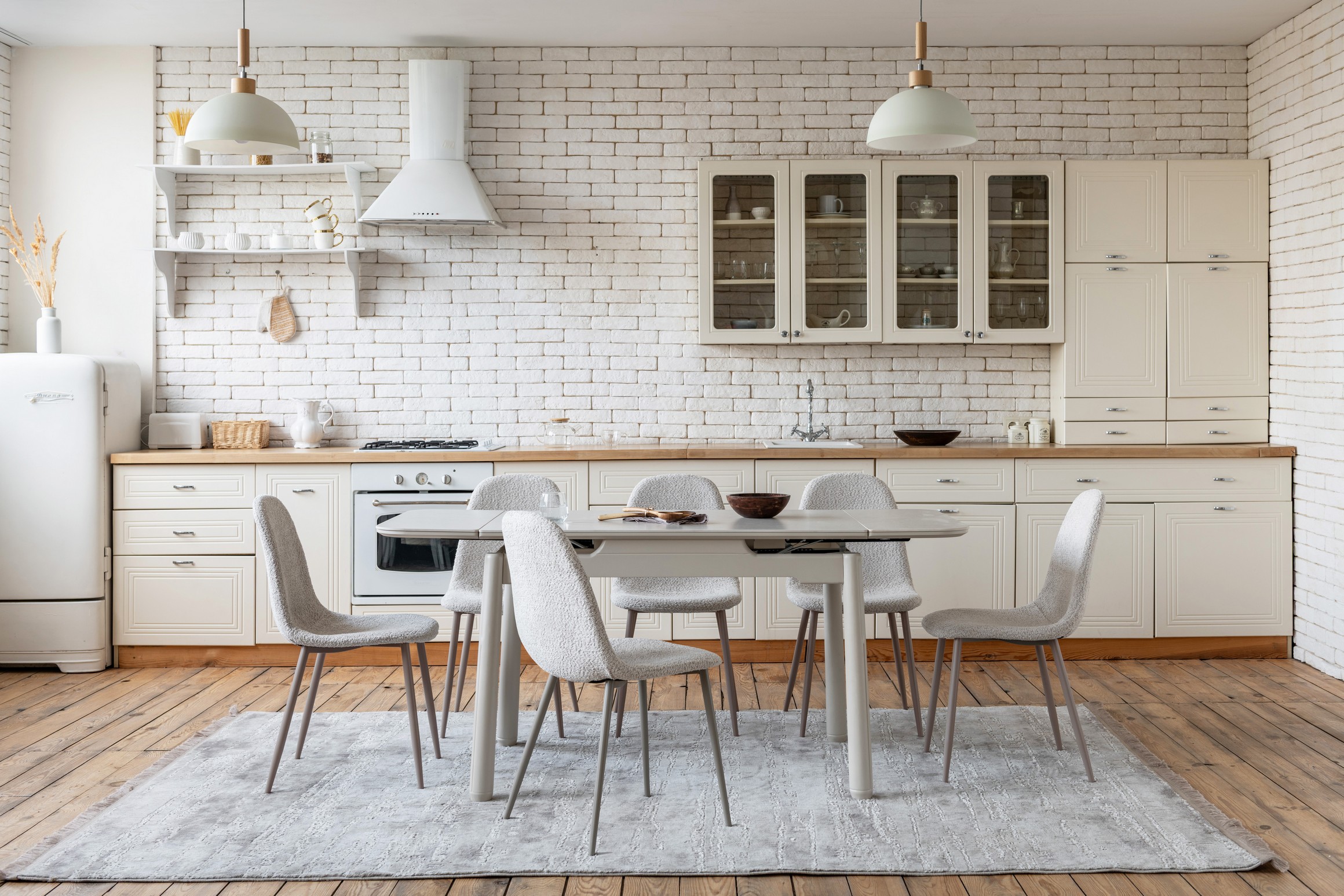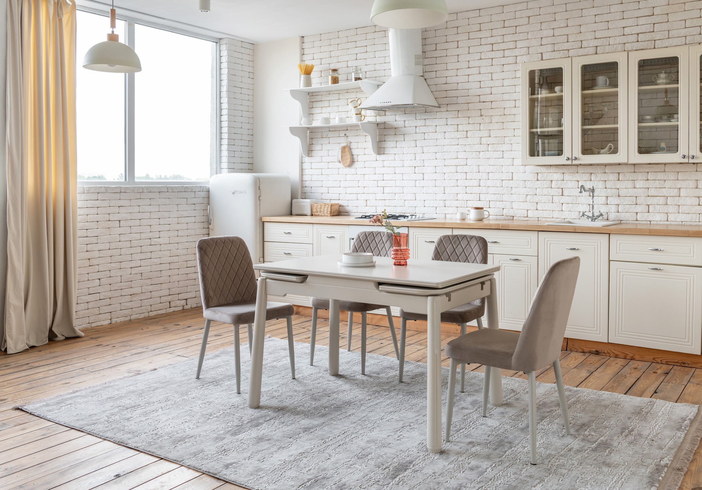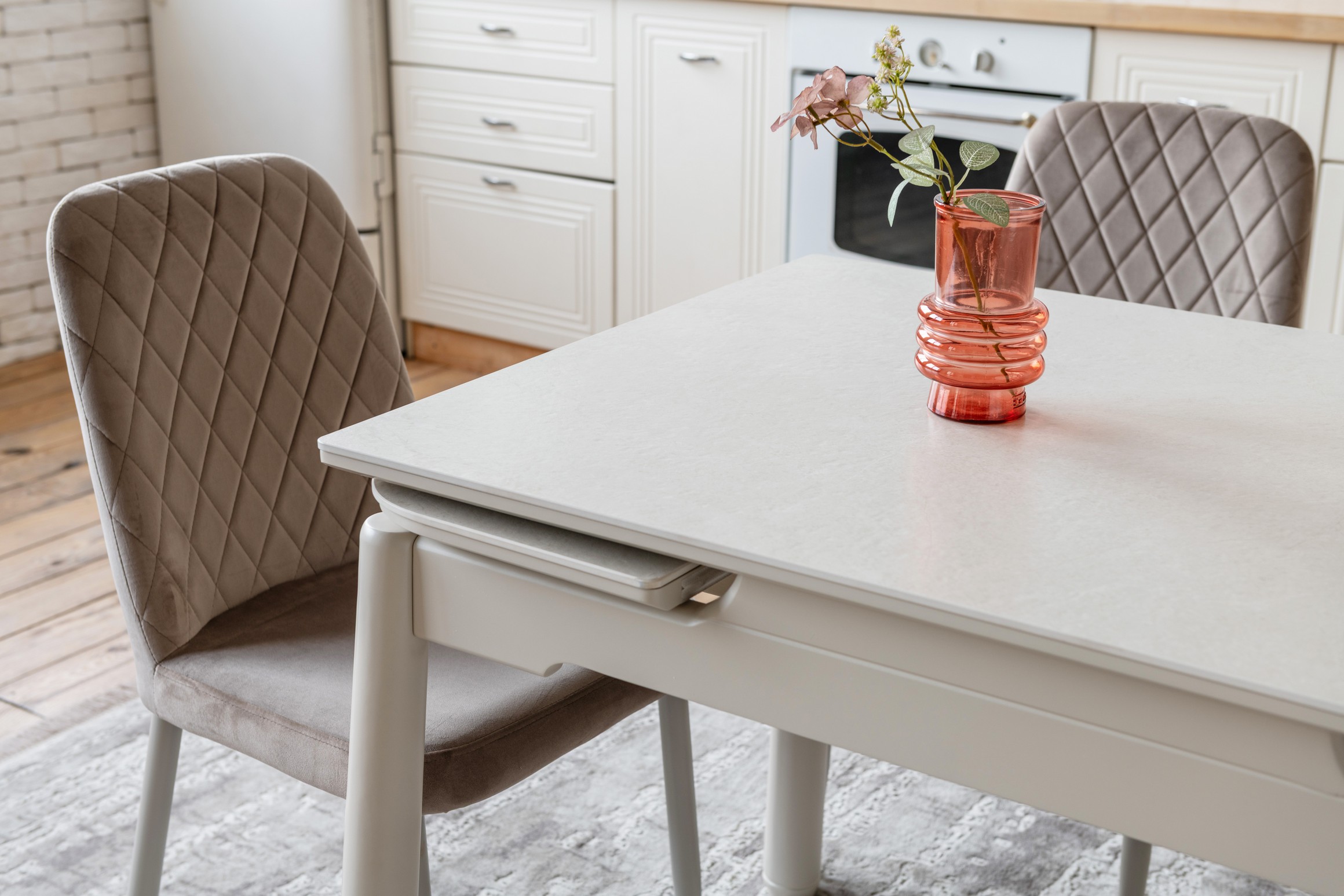 Стільниця з матової кераміки кольору крема саббія, доповнена міцною основою з пофарбованого дерева у відтінку капучино, виглядає гармонійно та елегантно. Її поверхня стійка до подряпин, плям і впливу високих температур — ідеальне рішення для щоденного використання.