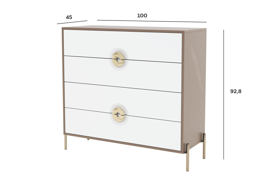 Комод Фуріоза з 4 шухлядами 100 см, Глиняний сірий, лак / Білий шовк