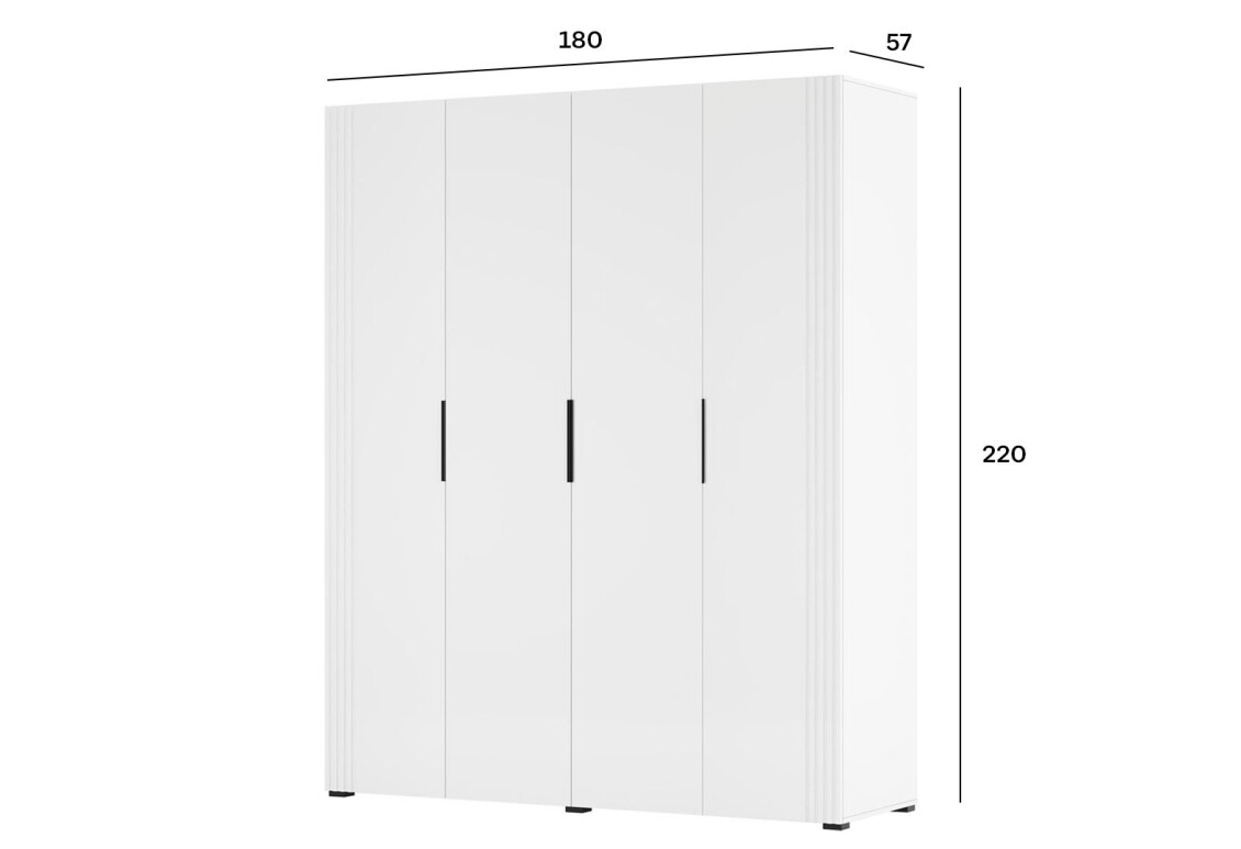 Характеристики та особливості- Розмір: ширина 180 см, висота 220 см, глибина 57 см – оптимальні габарити для зберігання великої кількості речей без зайвого навантаження на простір.