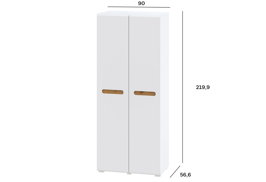 Шафа Світ Меблів Бянко 2-дверна – це сучасний та функціональний елемент інтер'єру, який стане ідеальним рішенням для вашої спальні або вітальні. Виготовлена з якісних матеріалів, ця шафа поєднує в собі стильний дизайн та практичність. Її глянцевий фасад з МДФ у білому кольорі з вставкою дуба аппалачі надає елегантності та свіжості будь-якому простору. Ширина 90 см, висота 219.9 см та глибина 56.6 см роблять цю шафу компактною, але водночас місткою, завдяки наявності штанги та полиць для зручного зберігання одягу та аксесуарів.
