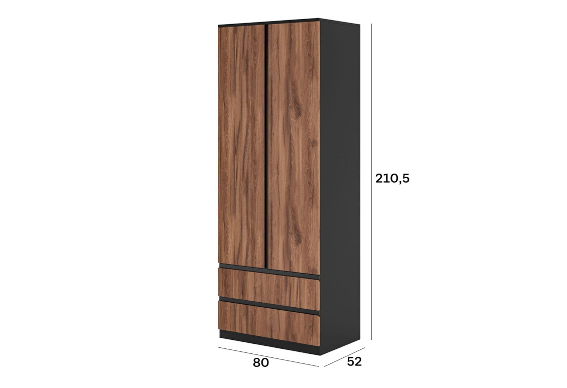 Шафа Світ Меблів Фріда дводверна з 2 шухлядами – це ідеальний вибір для тих, хто цінує поєднання сучасного дизайну, функціональності та надійності. Завдяки своїм компактним розмірам (ширина 80 см, висота 210,5 см, глибина 52 см) вона легко впишеться в будь-який інтер'єр, не займаючи багато місця. Чорний колір у поєднанні з дубом ліворно додає елегантності, а якісні матеріали, з яких виготовлена шафа, гарантують її довговічність. Фурнітура з телескопічними напрямними повного висуву забезпечує зручний доступ до вмісту шухляд, що робить використання шафи ще більш комфортним.